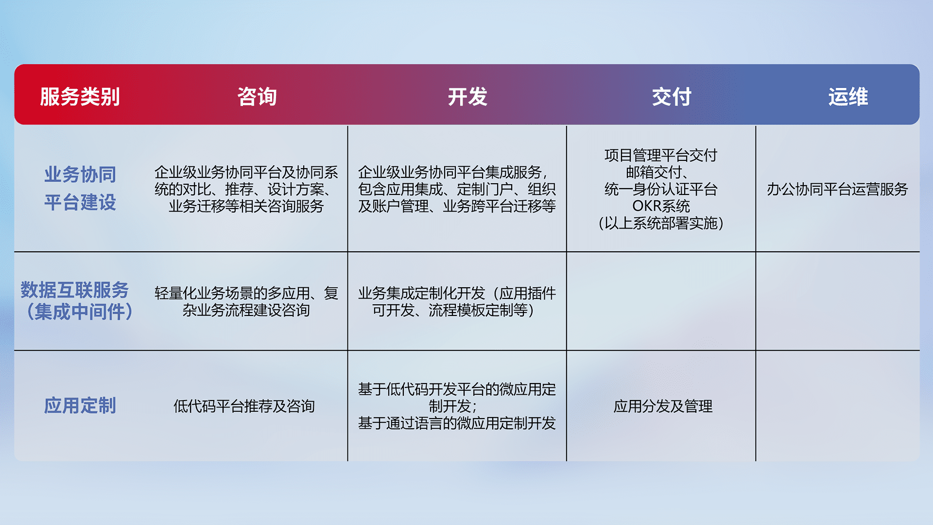 针对钉钉、、、、企微、、、、IDaas等平台级产品提供产品的规划、、方案、、、、交付、、定制化开发等服务,,,,实现如统一协同办公、、、、智能客户服务、、、混合会议管理、、、、智能数据查询、、、等业务场景,,,,实现数字化转型。。